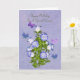 Customisez cette carte de voeux d'anniversaire pour un cousin en utilisant les modèles de texte fournis sur la couverture et à l'intérieur pour modifier ou supprimer le libellé. Quatre papillons colorés dans les tons bleu, violet et rose, planent autour d'un bouquet de fleurs en forme de cloche violet et blanc. L'arrière - plan est un bleu moyen mélangé. Les feuilles autour des fleurs sont d'un vert vif. Les fleurs sont modifiées de Za Za Scrap et Tubes et les papillons de Pats Floral et Fauna, tous deux de Digital Scrap Designs.