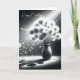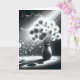 Bouquet de dandelion blanc dans un vase avec des semis flottants et des rayons de soleil sur un arrière - plan noir. Le texte peut être modifié.