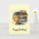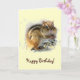 Ce mignon petit chipmunk souhaite un joyeux anniversaire à quelqu'un de spécial. C'est une adorable petite créature à la fourrure brun rougeâtre et à rayures brune et blanche sur le dos. Il bourre ses joues de graines ! Le texte dit : Joyeux anniversaire ! Essaie le gâteau ! Il peut être customisé pour répondre à vos besoins.