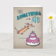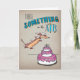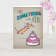 Silly Dachshund est super excité à l'idée de célébrer l'anniversaire de quelqu'un ! Le dessin est réalisé à la main avec des crayons et de l'encre colorés, avant d'être scanné en format numérique. Dachshund saute dans un gâteau d'anniversaire géant à trois couches. Le texte décoratif dit "Il y a quelque chose dans l'air". Couleur complète sur un arrière - plan en papier faux brun.