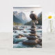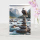 Un aigle chauve perche majestueusement sur une pile équilibrée de pierres au milieu d'une rivière qui coule avec des montagnes vertigineuses dans l'arrière - plan pour un anniversaire. Le texte peut être modifié.
