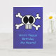 Une carte d'anniversaire orientée de pirate. Illustration graphique de cool, mignonne et drôle de crâne et d'os croisés. Un crâne blanc avec de grands yeux au beurre noir et longues dents blanches. Arrière - plan pourpre. Customisez le message ou partez comme est.