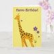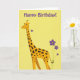 Carte d'anniversaire mignonne avec une girafe drôle et mignonne grignotant sur une fleur violette et tenant quelques fleurs avec sa queue en regardant le texte personnalisable "Joyeux anniversaire" sur arrière - plan jaune.