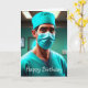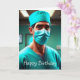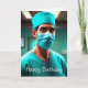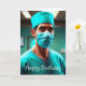 Cette carte d'anniversaire amusante présente un chirurgien prêt à fonctionner.