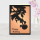 Cette simple et élégante carte d'anniversaire comporte une pomme suspendue à une branche contre un brillant ciel de coucher de soleil orange et jaune. La silhouette de l'arc crée un motif oriental.