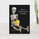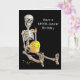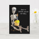 Squelette tenant un cupcake avec bougie éclairée et arroses colorées pour l'anniversaire d'Halloween
