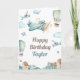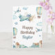 Personnalisez cette carte d'anniversaire adorable de thème d'aviation avec le nom d'un enfant pour la carte faite sur commande unique. Les caractéristiques de conception ce un vol d'ours de nounours dedans sur un avion avec les ballons à air chauds, les nuages gonflés et autre surface tout le vol dedans pour célébrer le jour spécial du garçon d'anniversaire. Les éléments de conception sont illustrés dans les aquarelles molles de bleu, de beige et de brun pour donner un thème magique de livre de contes. Vous pouvez également éditer le texte intérieur avec un message personnel à l'enfant, ou laissez l'échantillon à l'intérieur de la salutation des textes comme est.