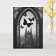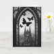 Des papillons noirs flottent sur une fenêtre voûtée, avec une cathédrale gothique en arrière - plan sur cette belle carte d'anniversaire noire et blanche.