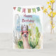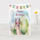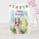 Llama aquarelle avec lunettes en forme de coeur, guirlande de drapeau, et un casquette d'anniversaire avec un paysage désertique dans l'arrière - plan. A l'intérieur, un voeu d'anniversaire et un lama avec ballons colorés