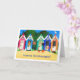 Carte d'anniversaire avec "Joyeux anniversaire" en français et quelques cabanes de plage d'un collage en papier peint à la main par Judy Adamson. Je peux facilement changer le texte avant sur demande et l'intérieur est laissé vide pour votre propre message.