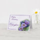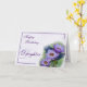 Une image des lis d'étang pourpres illustrés dans un motif d'aquarelle est le point focal de cette conception. Une frontière assortie d'aquarelle encadre la salutation de "joyeux anniversaire". Les options incluent pour la mère, la tante, la fille, la nièce, la soeur, et l'épouse. Sur l'intérieur, vous pouvez écrire une salutation faite sur commande centrée à l'intérieur d'une frontière pourpre.