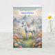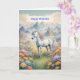 Envoyez des voeux pour un anniversaire magique. Souhaitez à quelqu'un un heureux anniversaire de licorne. Une image rêveuse d'une licorne blanche avec un arc-en-ciel principal debout dans un champ de fleurs. dans l'arrière - plan sont des montagnes majestueuses.La carte parfaite pour donner à ceux qui aiment les licornes magiques et mystiques.