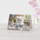 Un chaton blanc et moelleux aux yeux bleus saisissants est niché à l'intérieur d'une tasse fleurie bleue et blanche sur une nappe en dentelle avec des fleurs oubliées, pas de fleurs comme la lumière du soleil filtre à travers une fenêtre. Le texte intérieur peut être modifié.