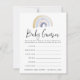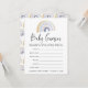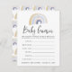 Carte de jeu de devinettes baby shower mignonne avec un arc-en-ciel bleu et or en haut. L'expression "Baby Guesses" est présentée dans un script de calligraphie moderne. Personnalisez avec des instructions personnalisées, des critères de devinette, le nom et la date de baby shower de la mère. Le design s'harmonise avec notre collection d'Aquarelles Jolies et Colorées Arc-en-ciel et enfants.