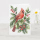 Aquarelle cardinal et houx aux baies. L'intérieur de la carte dit "Joyeux Noël" à l'intérieur gauche en rouge.