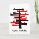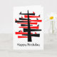 Un arbre abstrait en rouge et noir avec de petits oiseaux triangulaires peut-être chanter à l'aube. Deux des oiseaux, un en rouge et un en noir, s'assoient à la conversion sur une branche inférieure. Mais bien sûr, toute la composition est comme une conversation en forme et en couleur. L'arbre ne ressemble peut-être pas à un cèdre du Liban. Selon l'épopée sumérienne de Gilgamesh, les cèdres du Liban étaient considérés comme le lieu d'habitation des dieux. "Joyeux anniversaire" à l'avant et à l'intérieur (personnalisable) Une version plus petite du motif principal est également utilisée pour décorer l'intérieur.