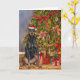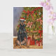 Cette carte de Noël présente un portrait aquarelle d'un chien Doberman Pinscher portant un chapeau santa assis sous un sapin de Noël.