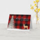 Pin de Noël blanc avec cloches d'or, cerf et un oiseau portant foulard d'hiver sur la bûcheron rouge et noir plaid pour Joyeux Noël et bonne nouvelle année. Le texte est modifiable.