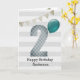 Une carte garçon de 2e anniversaire en argent et bleu, que vous pouvez personnaliser avec son nom. L'avant de cette carte de 2ème anniversaire moderne lui présente le numéro deux dans un design rayé bleu avec un ballon bleu prêt à flotter. L'arrière - plan est un blanc et gris doux avec une bannière à bouts argentés en haut. Le message intérieur peut être facilement personnalisé si vous le souhaitez. Une carte unique de 2ème anniversaire garde pour lui.