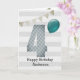 Une carte de 4ème anniversaire en argent et bleu pour le garçon d'anniversaire, que vous pouvez personnaliser le front avec son nom. La façade de cette carte moderne de 4ème anniversaire pour les garçons comporte le numéro quatre dans un design rayé bleu avec un ballon bleu prêt à flotter. L'arrière - plan est un blanc et gris doux avec une bannière à bouts argentés en haut. Le message intérieur peut être facilement personnalisé si vous le souhaitez. Un souvenir unique pour lui.