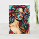 Carte blanche pour juste dire bonjour, ou pour toute occasion. Art unique de l'air représentant une belle femme moderne avec des cheveux colorés et des lunettes de soleil en bikini à la plage avec un reflet dans eux. Pop art style bande dessinée art fracturé.