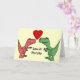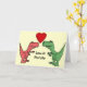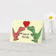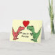 Carte de vœux humoristique de dinosaures amoureux, un t-rex vert et une femelle rose, avec la phrase Amour à la première bouchée. C'est mignon, amusant et plein de personnalité. Excellente idée de cadeau.