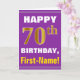 Ce design de carte anniversaire-orienté simple de salutation comporte un souhait chaud d'anniversaire comme le "JOYEUX soixante-dixième ANNIVERSAIRE, prénom !" sur l'avant, en caractères gras sur un pourpre a coloré l'arrière - plan. Le nombre d'anniversaire a un faux/imitation or-comme le regard de coloration. Le nom sur l'avant peut être personnalisé. Les caractéristiques intérieures un message d'anniversaire qui peut être customisé. Une carte de voeux comme ceci pourrait être une manière d'amusement de fournir des souhaits d'anniversaire à quelqu'un qui célèbre leur soixante-dixième anniversaire. [~Z0000277]