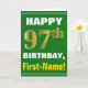 Ce design de carte anniversaire-orienté simple de salutation comporte un souhait chaud d'anniversaire comme le "JOYEUX quatre-vingt-dix-septième ANNIVERSAIRE, prénom !" sur l'avant, en caractères gras sur un vert a coloré l'arrière - plan. Le nombre d'anniversaire a un faux/imitation or-comme le regard de coloration. Le nom sur l'avant peut être personnalisé. Les caractéristiques intérieures un message d'anniversaire qui peut être personnalisé. Une carte de voeux comme ceci pourrait être une manière d'amusement de fournir des souhaits d'anniversaire à quelqu'un qui célèbre leur quatre-vingt-dix anniversaires de septième. [~Z0000279]