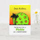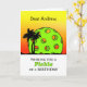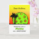 Carte de voeux avant faite sur commande d'anniversaire comportant un pickleball agissant en tant que soleil et palmiers contre un ciel de coucher du soleil. Pickleball folâtre le thème dans des couleurs lumineuses. La boule est une couleur verte acide lumineuse. La silhouette des palmiers lui donne un sentiment tropical. Changez le nom ou ajoutez l'autre texte pour une salutation personnalisée. Pickleball et palmiers inspirés par Pixabay. Art, image, et studios de Shoaff Ballanger de © de copyright de vers.
