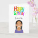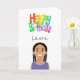 Image mignonne d'un personnage féminin avec du texte personnalisable à l'intérieur et à l'extérieur et coloré Joyeux texte d'anniversaire sur le devant. Les cheveux, les sourcils et les couleurs des vêtements peuvent facilement être changés.
