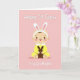This card shows a sweet cartoon baby centered on a soft blush-pink background, looking forward with big shining eyes and rosy cheeks that suggest a gentle, affectionate mood. A headband with tall white bunny ears and pale pink inner details adds a springtime touch 🐰. The baby wears a sunny yellow one-piece with a white collar, and the close, careful pose feels like a small gesture of friendship. Held snug against the chest is a simple dark-brown plush rabbit-like toy, as if it’s being hugged for comfort 🐇. The design stays uncluttered so the baby and toy feel like the whole scene, with the warm pastel colors doing most of the storytelling. Text appears both above and below the baby in a thin, flowing style, set in a dark tone that stands out clearly against the pink. The baby’s little foot coverings include light pink circular pads on the soles.