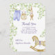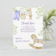 La carte de Baby shower en Merci plat présente de belles illustrations aquarelle de vêtements de bébé mignons accrochés sur une ligne à sécher, un mignon lapin farci, un adorable cheval à bascule au bas de la carte, et tous ces articles sont entourés de branches délicates avec des feuilles vert clair.