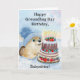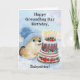 This hand-painted watercolor and pen illustration features a cute groundhog peeking out of his den as he reaches for a chocolate and vanilla cake topped with strawberries, blueberries, and boysenberries. A funny card for a babysitter!