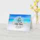 Carte d'anniversaire avec l'image d'une plage tropicale aux eaux turquoise cristallines et d'une plage de sable blanc avec ciel bleu azur au-dessus. Texte dit Sun Sand and and Salty Kisses.