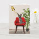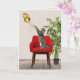 Chat de tabby gris jouant avec ballon en feuille d'or et rubans sur une chaise rouge pour 8ème anniversaire. Le texte intérieur est modifiable.