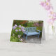 Banc en bois bleu dans le jardin de printemps carte de voeux
