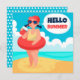 Carte des jours de plage lumineuse et joyeuse avec fille mignonne pour accueillir la nouvelle saison. Videz sur le dos pour votre note personnelle.
