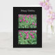 Une belle carte avec des photos de belles tulipes violettes/fushia au milieu de leur joli feuillage vert.