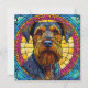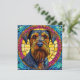 Portrait d'un chien avec une barbe épaisse et boisée et des yeux expressifs, encadré par un arrière - plan vitrail animé dans les tons jaune, rose et bleu.