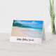 Carte d'anniversaire avec une photo d'un magnifique lieu de vacances. Ciel bleu vif, plage de sable doux avec eaux cristallines cristallines bleu tropical. Une montagne couverte d'arbres luxuriants dans l'arrière - plan. Photographie pittoresque et tranquille.