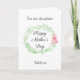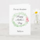 Une carte de fille pour la fête des mères, avec une belle aquarelle verte de laurier et de fleurs roses, que vous pourrez facilement personnaliser sur le devant avec son nom. Le message à l'intérieur de cette jolie carte de fête des mères de fille exprime un message sincère, que vous pouvez également personnaliser si vous le souhaitez. Le dos comporte la même aquarelle verte de laurier avec des fleurs roses, avec un espace pour que vous puissiez y mettre les noms du ou des enfants ou ce que vous voulez. Un doux souvenir de fête des mères qui est personnalisé et qui sera certainement chéri.