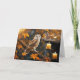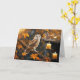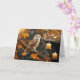 Une image mystique d'un beau hibou perché sur une branche d'arbre avec un feuillage et des feuilles de couleur automnale et deux bougies.