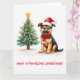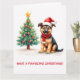 Une jolie scène de Noël avec un adorable berger allemand portant un chapeau de Père Noël et un foulard rouge assis joyeusement à côté d'un sapin de Noël.