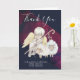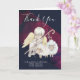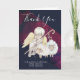 Un carte de remerciements de Noël à thème chrétien. Conçu avec un ange doux aux ailes jaunes tenant un crook berger. Assis avec des agneaux moelleux blancs. Arrière - plan couleur marine bleu et bordeaux, avec de minuscules éclats de parties scintillant faux or brillant (pas la parties scintillant réelle seulement une image imprimée). Personnalisez votre message. Merci écrit en écriture de script tendance.