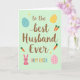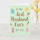 This card features a soft pastel green background that feels like an early spring morning 🌷. Centered down the page, the main message reads “to the best Husband Ever” in warm brown lettering, arranged tall so it becomes the focal point. Around it float four decorated egg shapes in gentle blue, yellow, and pink, detailed with white dots, small curving accents, and tiny white flower clusters that add a sweet, affectionate tone. Four orange carrots with leafy green tops are scattered nearby, giving the scene a fresh-from-the-garden look that pairs nicely with the loving message. In the lower left, a simple pink bunny with long ears looks upward with a tender, admiring gaze 🐰. Two small yellow starburst-like flowers sit in open spaces like little glints of light. Beneath the main wording, “HAPPY EASTER” appears in mixed bright colors, each letter spaced out in a tidy line near the bottom. The eggs show white polka dots, curled pink lines, and small white blossoms against their pastel shells.