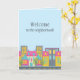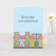 "Bienvenue dans le quartier !" carte. Le design présente un joli quartier urbain sur un arrière - plan bleu clair. Idéal pour condos et appartements.