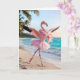 A flamingo dances while wearing a pink tutu and a feathered boa as it stands on a sandy beach, with a turquoise ocean and palm trees forming a tropical backdrop.