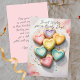 Voici notre charmante carte de vœux plate personnalisable, parfaite pour envoyer des messages sincères à vos proches. Le recto de la carte présente un design charmant avec sept biscuits en forme de cœur magnifiquement décorés de couleurs pastel, disposés selon un motif visuellement agréable. Chaque biscuit est orné de détails en glaçage complexes, ajoutant une touche d'élégance et de douceur à la carte. Le texte sur le recto indique "Sweet Wishes for a Lovely Day !" (Jolis vœux pour une journée merveilleuse) dans une police élégante de style manuscrit, complétant parfaitement le design fantaisiste.