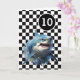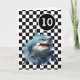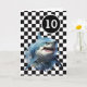 Une carte de requin 10ème anniversaire pour les garçons. Doté d'un arrière - plan à damiers noir et blanc à l'avant avec un endroit que vous pouvez facilement personnaliser l'âge si nécessaire. Cette carte d'anniversaire de requin ravira les fans de requins !