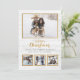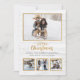 Une carte de Noël festive qui présente quatre de vos photos préférées entourées d'une bordure d'or sur un arrière - plan blanc en bois de ferme. "Joyeux Noël" apparaît dans le centre de la typographie en écriture or.le dos de la carte a un motif en or et blanc flocon de neige. Personnalisez ce carte photo de vacances unique avec vos noms de famille. Conçu pour vous par Blackberry Boulevard.